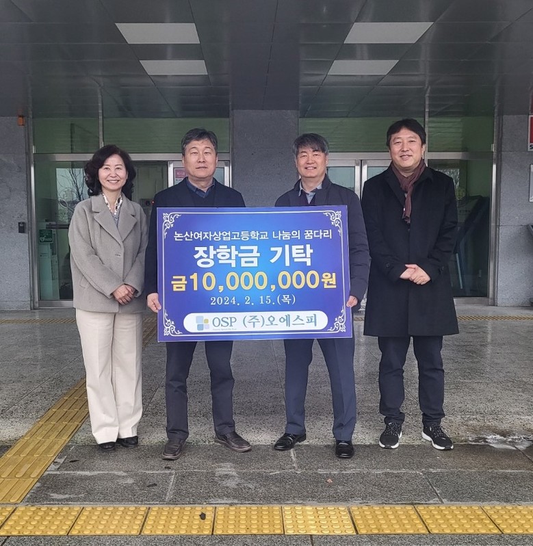 [논산시 세계타임즈=백택기 기자] 논산여자상업고등학교(교장 조한호)는 지난 15일(목) ㈜오에스피(대표 강재구)로부터 학교발전을 위한 장학금 10,000,000원을 전달받았다고 밝혔다.