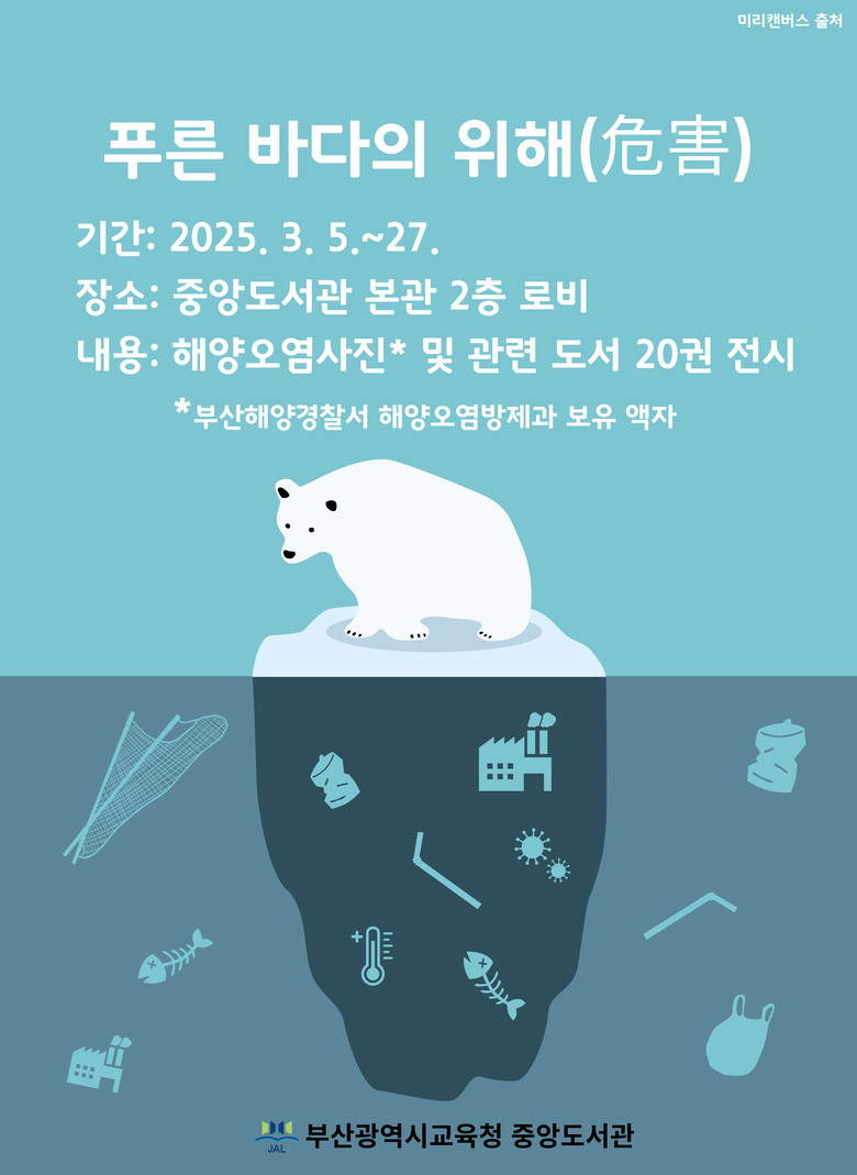 사진전은 부산해양경찰서 해양오염방제과에서 제공한 해양오염 관련 액자 15점과 해양환경 보호를 주제로 한 도서 20권을 전시한다. 해양쓰레기, 플라스틱 오염, 기후 변화 등으로 인한 해양 생태계 변화를 직관적으로 보여주고, 해양오염 문제를 쉽게 이해할 수 있도록 구성했다.