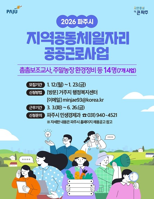참여 희망자는 모집 기간 내 신청서와 구비서류를 준비해 거주지 행정복지센터를 방문하거나 파주시청 민생경제과 담당자의 전자우편으로 제출해야 한다. 자세한 사항은 파주시청 누리집을 참고하거나 파주시 민생경제과(☎031-940-4521)로 문의하면 된다.