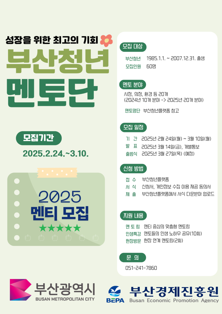이번 '2025년 부산청년멘토단'의 멘티를 하고자 하는 청년은 오늘(24일)부터 3월 10일까지 부산청년플랫폼을 통해 신청하면 된다.