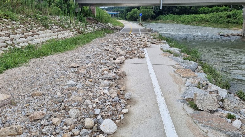 실제로 현장을 확인한 결과 도로 옆 사면은 빗물에 쓸려 자갈과 흙이 대거 유실됐고 자전거도로는 토사에 묻혀 정상적인 통행이 어려운 상태다. 도로 하부 지지층이 손상되며 도로 붕괴 가능성까지 우려되는 상황이지만, 안내 표지나 통제선조차 없는 상태다.