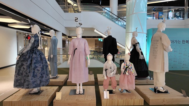 한복상점에서는 한글 디자인 한복을 포함한 사시사철 복식의 서사를 담은 전통한복 ‘사계’ 전시와 한복 대여 체험, 사은품 부스 등이 연계된 상점을 만나볼 수 있다.