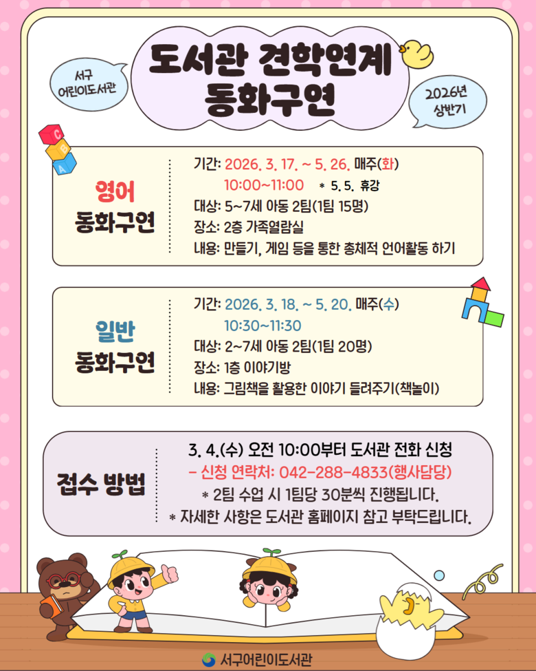 수업은 3월 17일부터 5월 26일까지 매주 화요일과 수요일 총 20회차로 진행되며, 일반 동화구연(2~7세 대상)과 영어 동화구연(5~7세 대상)으로 나눠 운영된다.