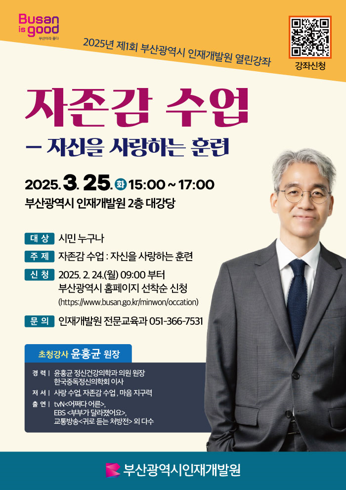 강연은 누구나 무료로 참여할 수 있으며, 시 누리집 「부산민원120-행사/모집 신청」(busan.go.kr/minwon/occation) 또는 전화(인재개발원 전문교육과 ☎ 051-366-7531)로 신청하면 된다. 선착순 마감으로 진행된다.