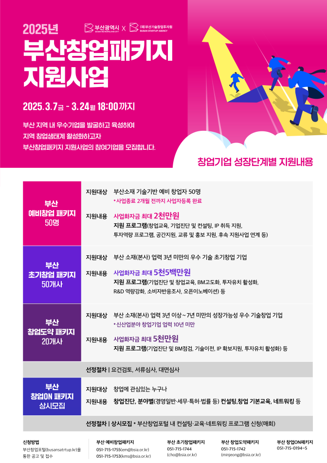 부산시(시장 박형준)는 오늘(7일)부터 3월 24일까지 창업기업의 지속 성장을 위해 단계별로 맞춤 지원하는 「2025년 부산창업패키지 지원사업」의 첫 통합공고를 시행해, 참여 기업을 본격적으로 모집한다고 밝혔다.