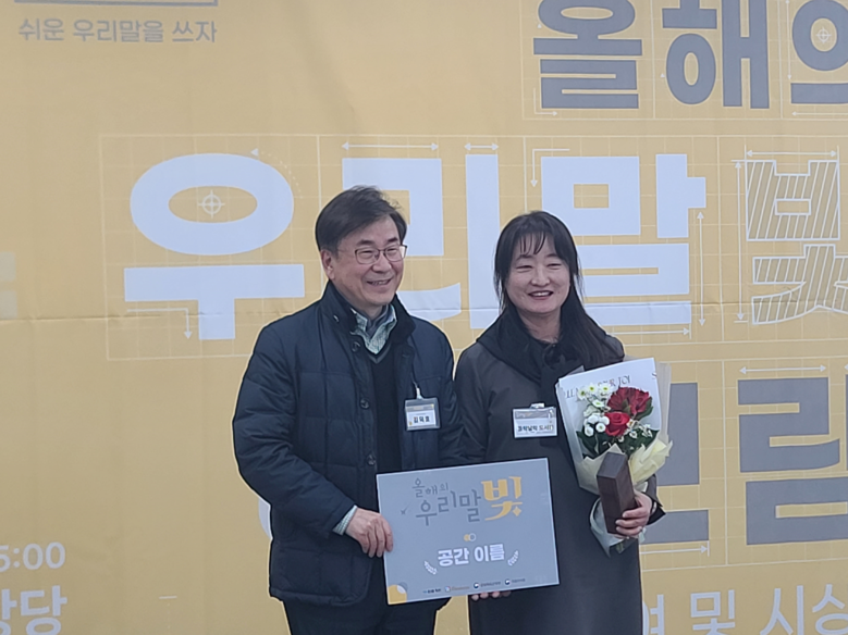 ‘들락날락’은 ‘도담도담나눔터’(서울시)와 ‘맑은물 상상누리’(경기도)와 함께 공간 이름 부문에 선정돼 어제(23일) 오후 3시 한글학회에서 진행된 시상식에서 보람*을 받았다. * 보람: 배지에 해당하는 우리말