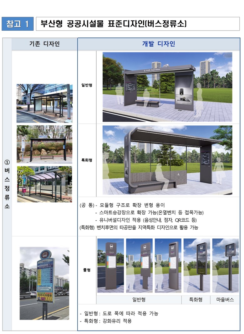 지난해 16개 구·군의 우선순위 수요조사를 거쳐 부산형 공공시설물 표준디자인 개발 용역을 진행했으며, 공공디자인 진흥위원회 의결을 통해 최종 디자인을 확정했다.