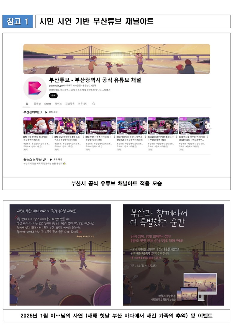 박광명 시 대변인은 “부산 웹툰 작가들과의 협업으로 웹툰 페스티벌이 열리는 도시 부산의 매력을 전국적으로 알릴 수 있기를 기대한다”라며, “'부산튜브'는 부산을 대표하는 시민 소통 채널인 만큼 이번 채널아트 이벤트를 통해 보다 적극적으로 소통하고 공감하는 채널이 되도록 노력하겠다. 2025년을 맞아 더욱 다채롭게 기획 중인 '부산튜브' 콘텐츠에도 많은 관심을 바란다”라고 밝혔다.