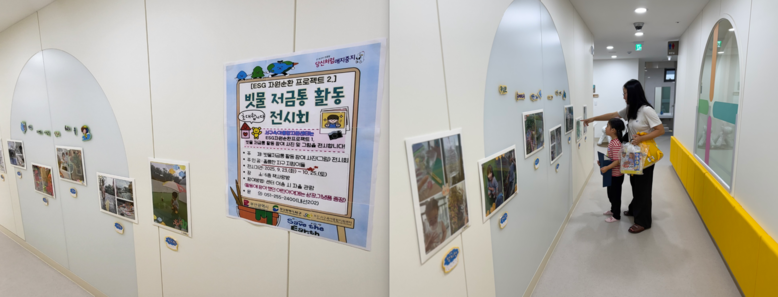 이번 전시는 ESG 자원순환 프로젝트의 일환으로 유아들이 재활용품을 활용해 직접 ‘빗물 저금통’을 제작하고 장마철 모은 빗물을 화분에 물 주기, 양말 빨기 등 생활 속에서 활용한 과정을 담았다.