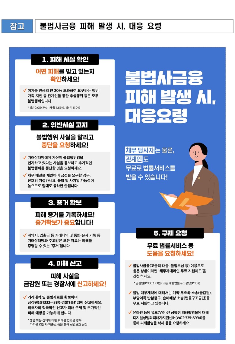 대부업 이용 시 ▲등록대부업체 여부를 확인(네이버 등 포털사이트에서 ‘대부업체 통합조회’ 검색)하고, ▲최고금리(연 20%)를 초과하는 이자는 불법이며, ▲대부계약서(구두·문자·SNS 등 비대면대출 지양)는 반드시 보관해야 하며, ▲약정 이자 외의 수수료·선이자 등은 불법이므로 계약에 응하지 않아야 한다.