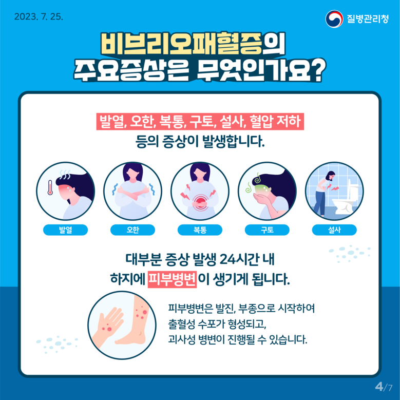 조규율 시 시민건강국장은 “비브리오패혈증은 예방 수칙을 지키는 것으로 충분히 예방할 수 있다”라며, “간 질환자, 당뇨병 등 기저질환이 있는 비브리오패혈증 고위험군은 어패류 등 해산물 섭취 시 특히 주의해 주시길 바라며, 섭취 후 발열, 오한, 복통 등 증상이 나타나면 바로 의료기관을 방문해 치료받기를 당부드린다”라고 전했다.