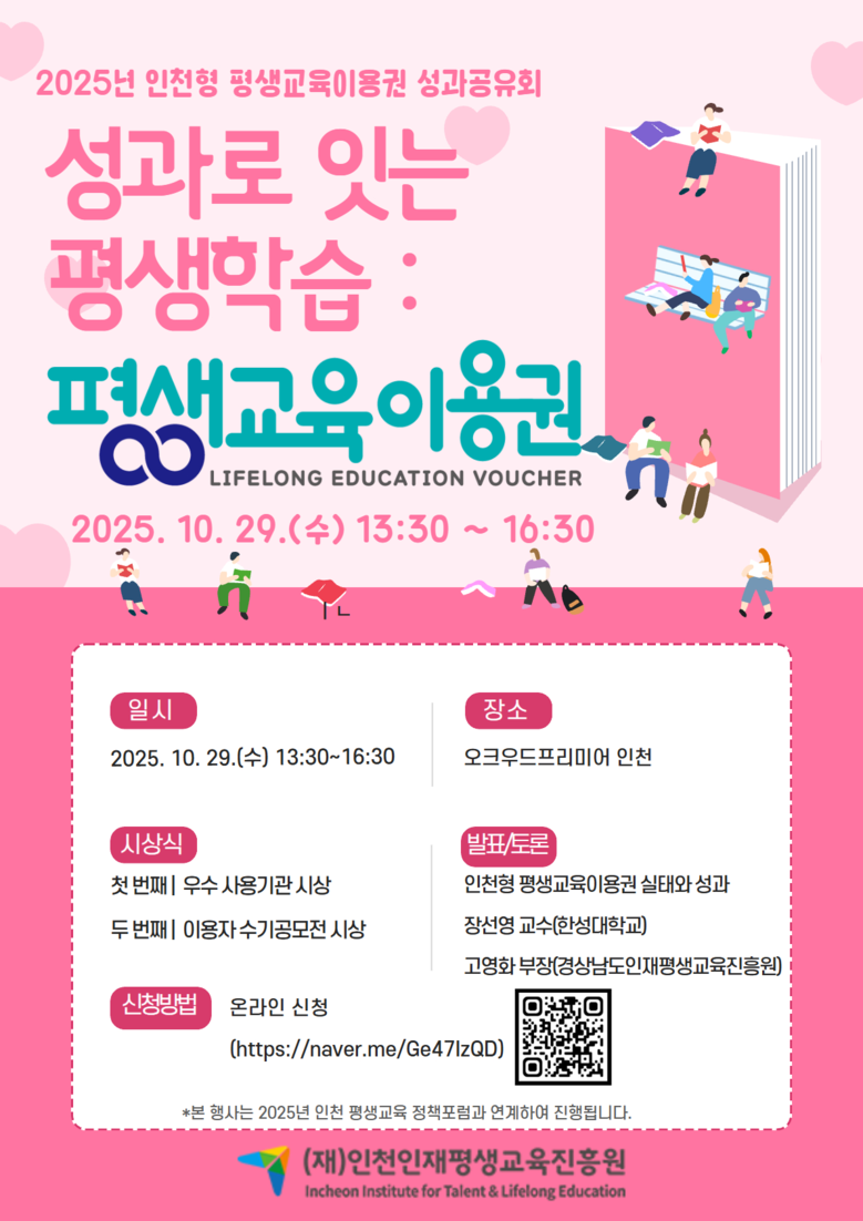 이번 성과공유회는 인천형 평생교육이용권 사업의 주요 추진 성과를 공유하고, 시민과 사용기관이 함께 만들어온 학습 성과를 격려하기 위한 자리이다. 행사는 △우수 사용기관 시상식 △이용자 수기공모전 시상식 △주제발표 순으로 진행된다.