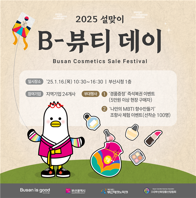 ◈ 전시·판매 공간(부스)과 연계한 경품행사와 부대행사 등 다양한 이벤트도 진행할 예정 [부산 세계타임즈=이용우 기자] 부산시(시장 박형준)는 내일(16일) 오전 10시 30분부터 오후 4시 30분까지 시청 1층(대회의실 앞)에서 「2025 설맞이 비-뷰티(B-beauty)데이」를 개최한다고 밝혔다.