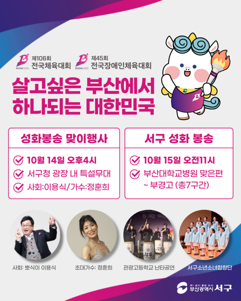 10월 14일(화) 성화봉송 맞이행사를 통해 안치된 성화는 10월 15일(수) 오전 11시부터 80명의 주자가 부산대학교병원 맞은편에서 출발하여 구덕운동장을 거쳐 부경고등학교까지 총 7구간, 1.98㎞를 릴레이 봉송한다. 서구는 이번 성화봉송 맞이행사 및 성화봉송을 통해 전국체전의 성공적인 개최 분위기를 조성하고, 주민들이 함께 참여하는 화합의 장을 조성할 계획이다.