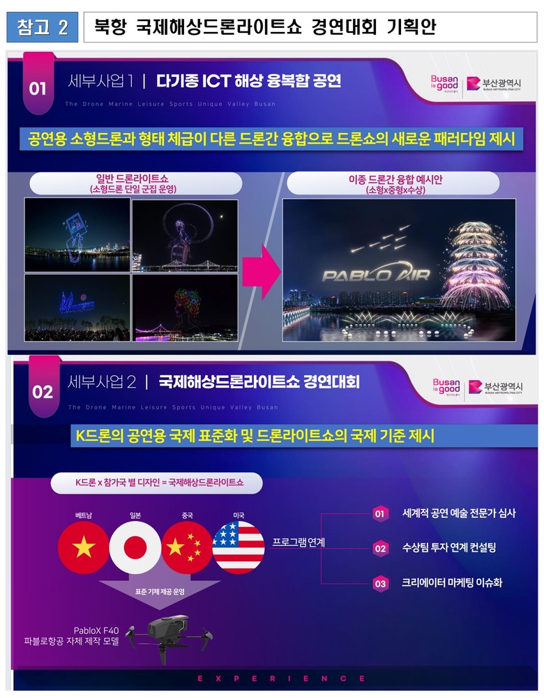 시는 중국, 베트남, 미국, 일본의 드론 라이트쇼 연출기업을 초청해 북항 친수공원에서 경연대회를 열고, 사업 공동 참여사인 '㈜파블로항공'은 대회 전야 행사로 케이팝(K-pop) 공연과 연계한 이색 다기종 융복합 해상 라이트쇼를 선보일 예정이다.