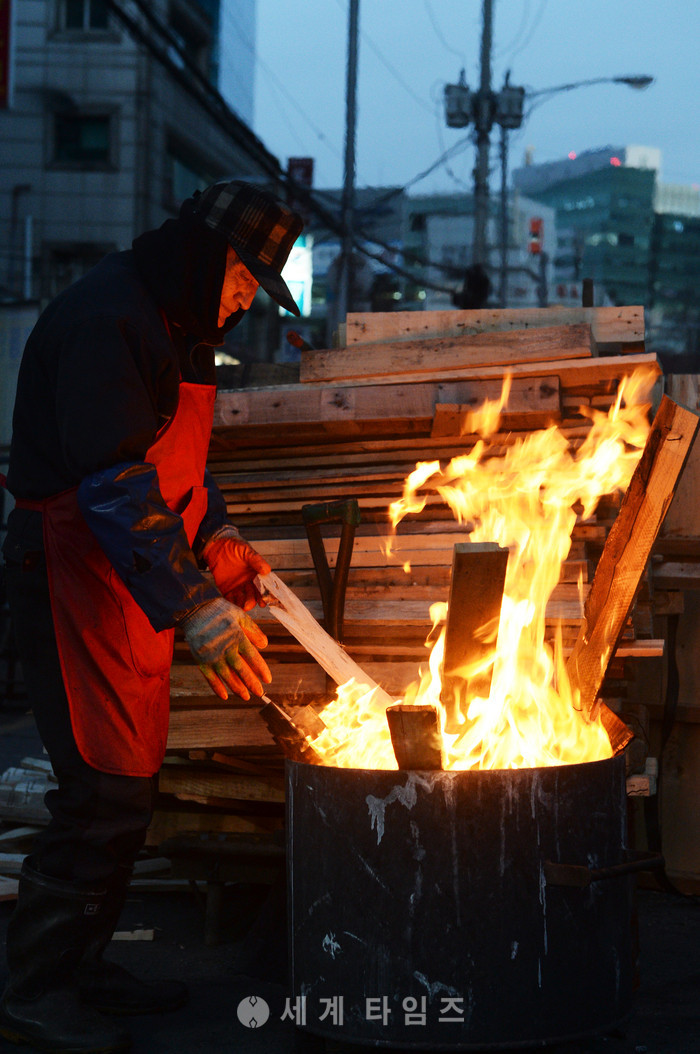 서울의 아침 최저기온이 영하 10도까지 떨어지는 등 전국적으로 한파가 기승을 부리는 31일 오전 서울 중구 중림시장에서 상인들이 모닥불을 피우고 추위를 피하고 있다. 2017.01.31.