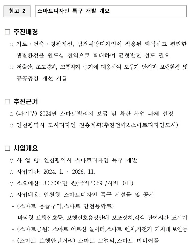 - 스마트 응급구역·안전통학로·스마트 공원·보행안전거리 등 4개 분야…시민 생활 편의와 안전 강화 - [인천 세계타임즈=심하린 기자] 인천광역시(시장 유정복)는 남동구 구월동 일원(인천시청 주변 약 1㎢)에 총사업비 33억 7천만 원(국비 70%, 시비 30%)을 투입해 전국 최초로 ‘스마트디자인 특구’를 조성한다고 밝혔다.