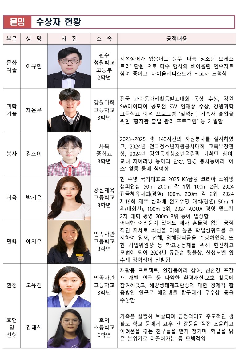 올해 수상자는 7개 부문에서 각 1명씩 총 7명으로, 지난 3월 17일부터 5월 1일까지 도내 학교장, 청소년 관련 기관‧단체장의 추천을 받아, 6월 23일(월) 강원특별자치도 청소년육성위원회 심사를 거쳐 최종 선정됐다.