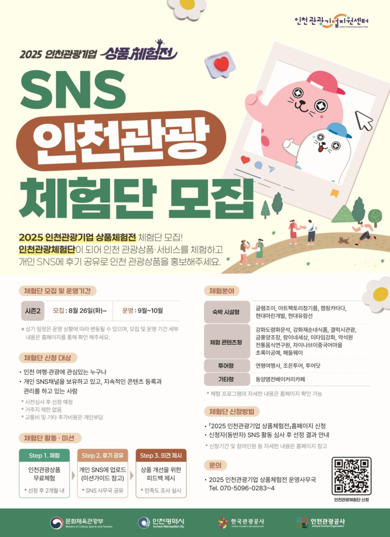 - 담금주 만들기·유람선 체험·개항장 투어 등 계절 맞춤형 프로그램 진행 - [인천 세계타임즈=심하린 기자] 인천광역시(시장 유정복)와 인천관광공사는 인천 관광기업의 판로확대와 마케팅 지원을 위한 ‘2025 인천관광기업 상품체험전(이하, 체험전)’시즌2 체험단 모집을 8월 26일부터 시작했다고 밝혔다.
