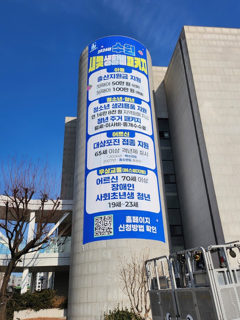 | ▲ 수원시청 청사 외벽에 수원시 새빛 생활비 패키지를 알리는 대형 현수막이 게시돼 있다. |