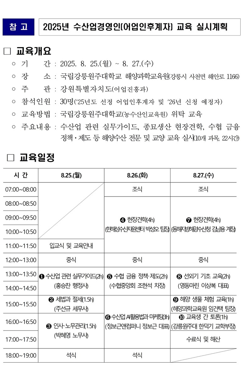 손창환 강원특별자치도 글로벌본부장은 “지속적인 수산업경영인 교육을 통해 전문 지식과 마인드를 갖춘 수산 전문 인력을 체계적으로 양성·관리하여 어촌 발전의 핵심 인재로 성장할 수 있도록 지원하겠다”고 밝혔다.