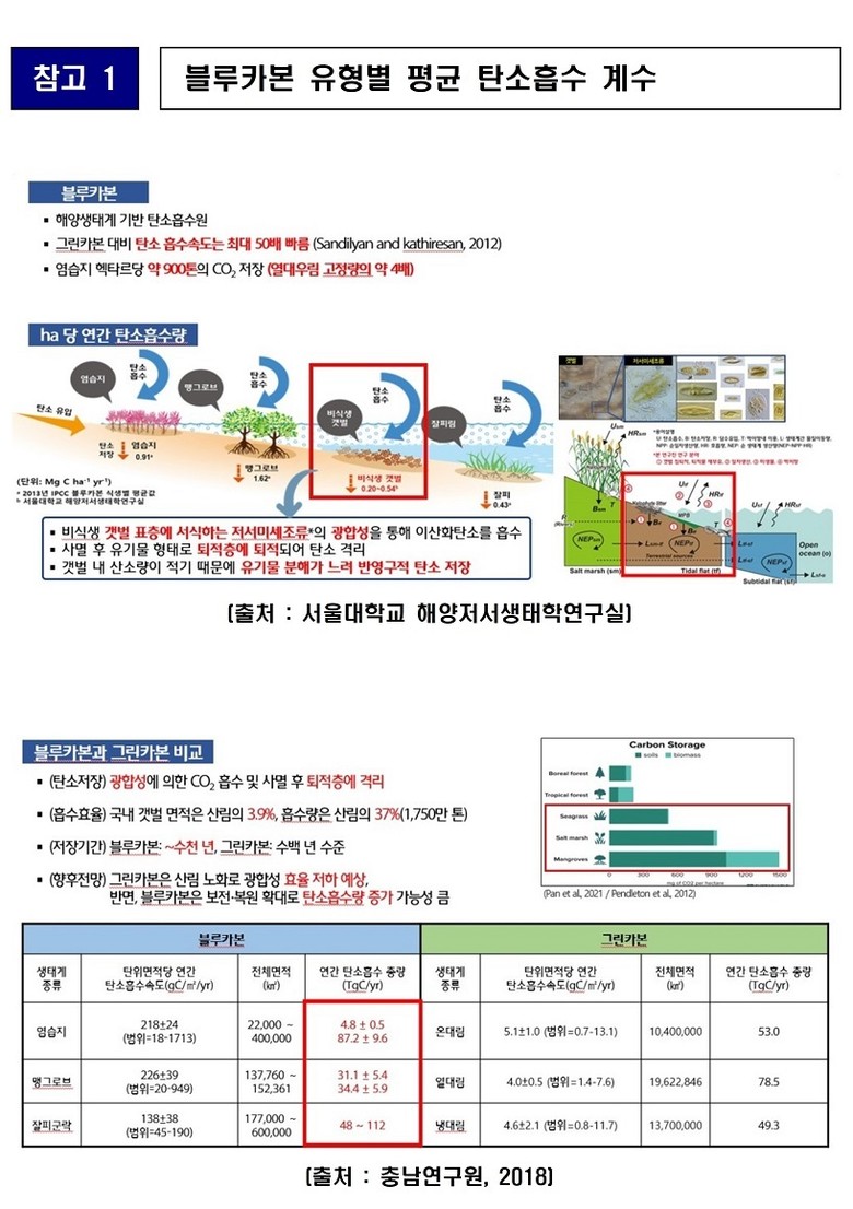 탄소흡수원으로서 블루카본은 육상생태계와 더불어 중요한 환경적 가치가 주목받고 있으며, 국가 온실가스 감축목표(NDC)인 2030년까지 40% 감축(2018년 대비) 목표 달성을 위한 핵심 수단으로 그 중요성은 날로 증대되고 있다.
