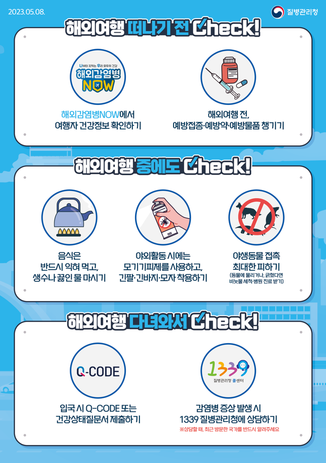 각종 해외감염병에 대한 정보는 '해외감염병나우(NOW)' 누리집(해외감염병NOW.kr)과 '여행건강 오피셜'(travelhealth.kr)에서 확인할 수 있다.