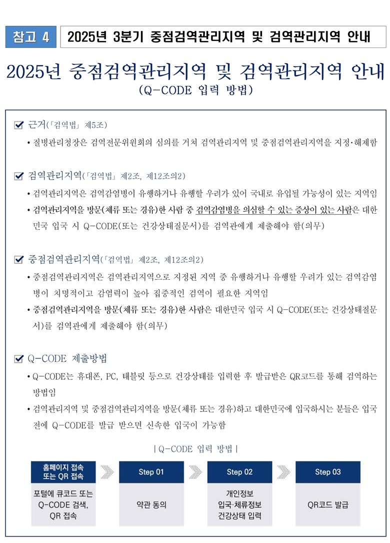 질병관리청은 해외유입감염병 예방과 확산 차단을 위해 올해(2025년) 3분기 중점검역관리지역 20개국을 지정·발표했으며, 해당 국가(지역) 체류·경유자는 큐코드(Q-CODE) 또는 건강상태질문서를 작성해 제출해야 한다.