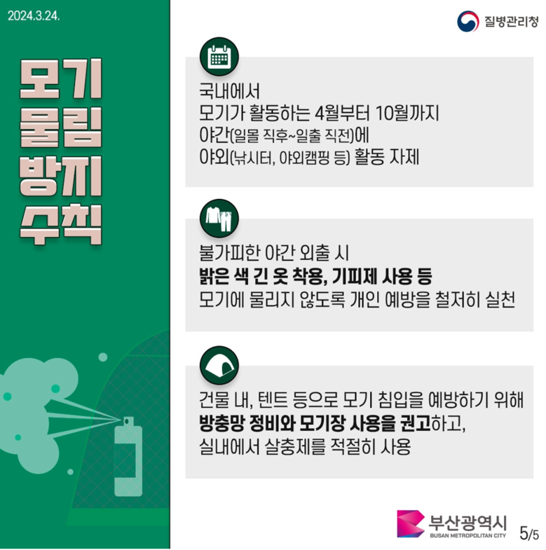 부산시(시장 박형준)는 여름방학과 휴가철을 맞아 해외여행을 계획 중인 시민들에게 호흡기 감염병과 모기매개감염병이 일부 국가에서 유행 중임을 알리며, 철저한 사전 예방과 개인방역수칙 준수를 당부한다고 밝혔다.