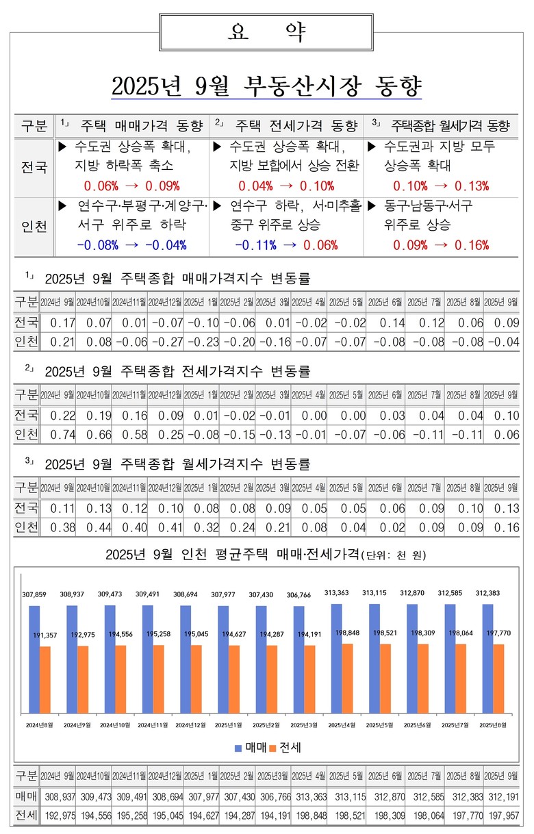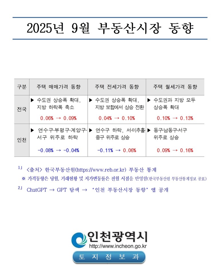 인천시가 한국부동산원의 부동산 통계정보를 분석한 ‘2025년 9월 부동산시장 동향 보고서’에 따르면, 9월 인천의 주택 매매가격지수 변동률은 전월 –0.08%에서 –0.04%로 나타나 하락폭이 축소됐다. 지역별로는 연수구(-0.14%→-0.09%), 서구(-0.14%→-0.09%), 계양구(-0.13%→-0.06%), 부평구(-0.05%→-0.06%) 등은 하락세가 지속됐으며, 동구(-0.06%→0.01%), 미추홀구(-0.04%→0.02%), 남동구(-0.03%→0.01%), 중구(-0.03%→0.03%) 등은 하락세에서 상승세로 전환됐다.