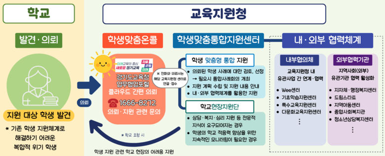 ‘경기형 학생맞춤통합지원체계’는 학교가 복합적 위기 학생을 발견하면 교육지원청으로 의뢰하고 교육지원청 학생맞춤통합지원센터는 의뢰한 내용을 통합적으로 진단·지원·관리하는 방식이다. 이를 통해 학교의 업무 부담을 최소화하고 학생별 맞춤 통합지원을 실현할 수 있다.