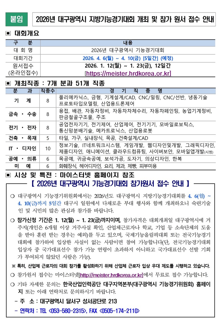 대회와 관련된 자세한 사항은 대구시 기능경기위원회(한국산업인력공단 대구지역본부 ☎053-580-2315)로 문의하거나, 우수숙련기술인 종합 포털사이트 ‘마이스터넷 홈페이지’를 참고하면 된다.