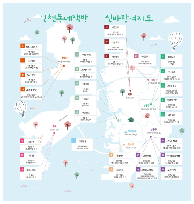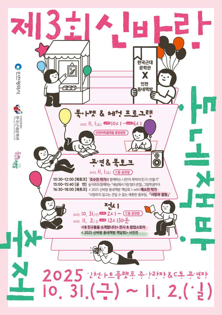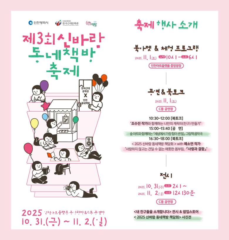이와 함께 인천아트플랫폼 C동 공연장에서는 그림책 원화전과 사진전이 결합된 전시 〈그림책으로 만나는 친구들〉이 열리고, 문학과 공연이 어우러진 북토크와 음악극이 시민을 맞이한다. 조수진, 예소연 등 인천을 대표하는 작가들이 참여해 창작의 영감과 문학의 감수성을 나누며, 시민 참여 이벤트인 〈동네책방 도장깨기〉 시상식도 함께 진행된다. 축제 전 기간에 걸친 전시와 공연, 시민 교류 프로그램을 통해 책방과 문학관, 작가와 독자가 함께 어우러지는 인천형 문학축제의 새로운 모델이 제시될 예정이다.