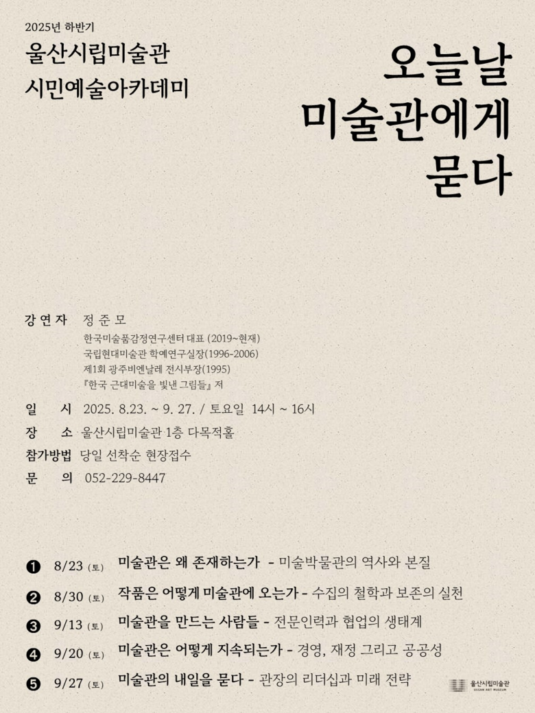 총 5회로 구성되며, 첫 강연인 23일 정준모 한국미술품감정연구센터 대표가 맡아 ‘미술관은 왜 존재하는가’를 주제로 현대 미술관의 탄생과 진화를 조명할 예정이다.