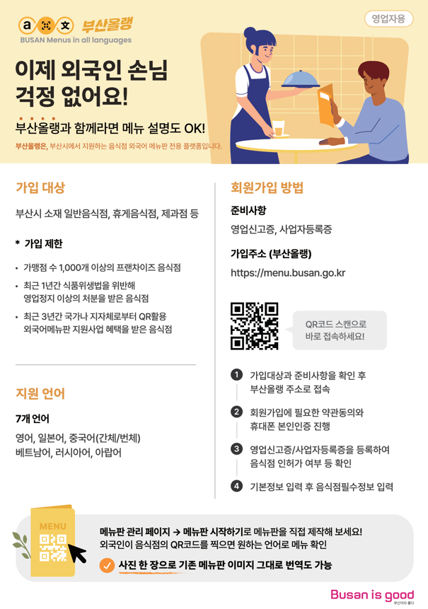 '부산올랭(Busan Menus in All Languages)'은 음식점 영업자가 메뉴 사진을 게시(업로드)하면 인공지능(AI)이 자동으로 인식·번역하고, 전문 번역가의 검수를 거쳐 큐알(QR) 기반 외국어 메뉴판을 제공하는 행정 플랫폼이다.