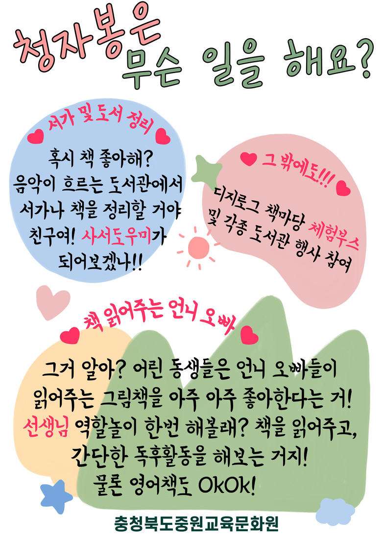 <충북교육사랑봉사단>은 ▲독서교육 프로그램 운영 지원 ▲도서관 견학 운영 지원 ▲도서 및 서가 정리 등 도서관 운영 전반을 지원하는 봉사단이다. 활동은 1일 3시간 기준으로 운영된다.
