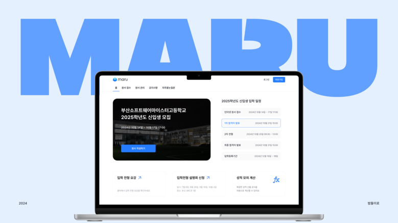 ‘마루(MARU)’는 학교의 2학년 전공동아리 프로젝트팀인 ‘밤돌이로’에서 개발한 시스템으로 ▲신입생 입학 원서 작성 및 접수 ▲자료 제출 ▲1, 2차 합격자 선발 ▲성적 모의 산출 등의 기능이 가능하다. 프로그램은 이번 2025학년도 신입생 선발 과정을 원활하게 수행해 그 신뢰성을 인정받았다.