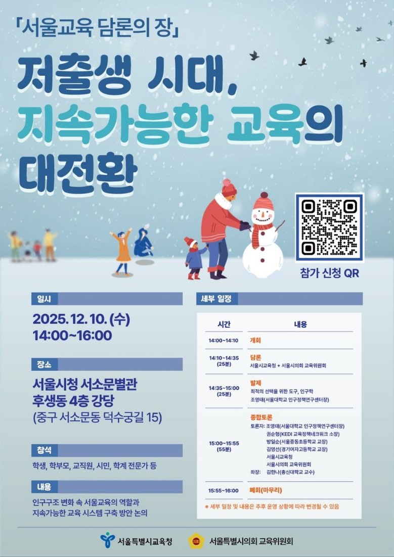 이번 행사는 저출생‧학령인구 감소로 인한 교육환경 변화에 주도적으로 대응하기 위해 서울시의회와 서울시교육청이 함께 마련한 공론의 장으로, 급격한 인구구조 변화 속에서 교육정책의 지속가능성을 확보하기 위한 의회와 교육청 간 정책 협력과 제도 개선 논의를 본격화하는 출발점이 될 전망이다.