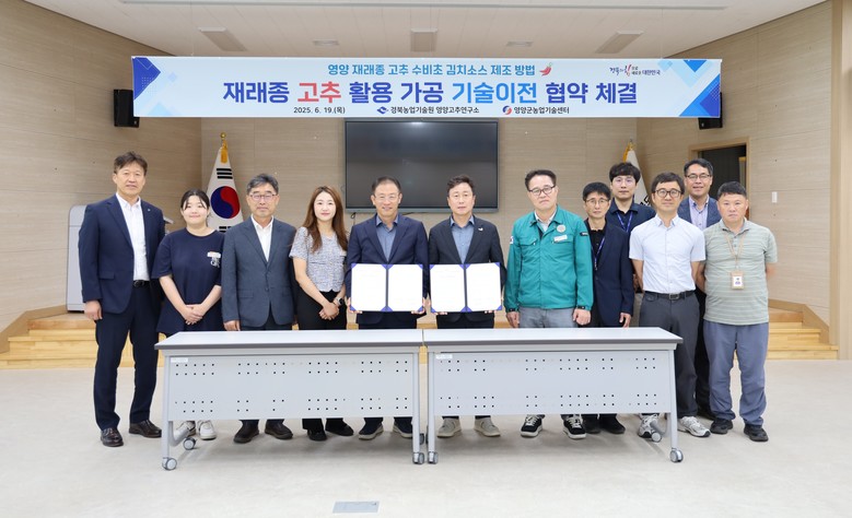 [경북 세계타임즈=한윤석 기자] 경상북도농업기술원은 19일 영양고추연구소와 경북전문대학교가 공동으로 개발한 영양지역 재래종 고추‘수비초’활용 ‘수비초 김치소스 제조기술’에 대해 영양군농업기술센터와 기술이전 협약을 체결했다.