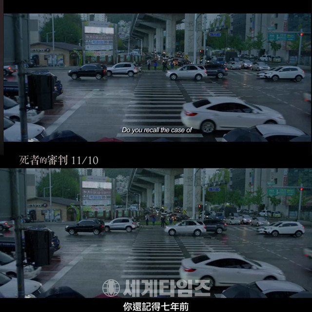 이어서 "7년 전 아들에게 전셋돈을 전해주려다 강도에 의해 목숨을 잃은 한 어머니의 안타까운 사건 기억하십니까?"라는 대사가 들리는 장면에서 각각 "Do you recall the case of a mother killed in a motorcycle robbery 7 years ago?", "你還記得七年前 一個母親在拿房租給兒子的路上 死於強盜殺人的案件嗎?"라는 자막이 등장해, 어머니가 강도에 의해 목숨을 잃은 것이 사실인지 영화에 대한 궁금증을 자아낸다.