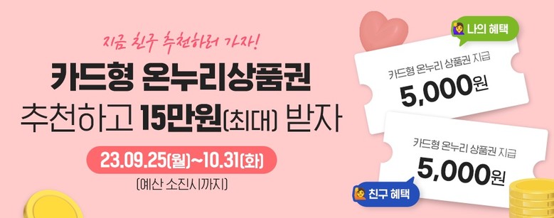 KT가 운영하는 충전식 카드형 온누리상품권 애플리케이션에 가입해 이용하고 있는 고객은 10월 31일까지 이벤트에 참여할 수 있다. 아직 앱에 가입하지 않은 지인에게 온누리상품권 1000원 이상을 선물하고, 선물을 받은 지인이 카드형 온누리상품권 앱에 신규 가입과 카드를 등록하면, 추천한 고객과 추천받은 지인 모두에게 각각 5000원이 지급된다. 이벤트 기간 동안 최대 30회까지 추천이 가능하며 30회 추천한 고객은 15만원을 지급받게 된다. 카드형 온누리상품권 앱 공지사항에서 자세한 참여 방법을 확인할 수 있다.