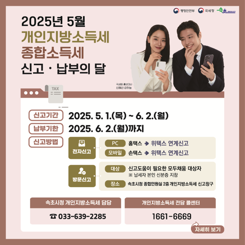 개인지방소득세 신고 창구에는 확정신고가 집중되는 5월 19일부터 1주간 속초시-속초세무서 신고창구 상호파견 협의를 통해 속초시청 세무과 직원과 속초세무서 직원이 상주하며 납세자들의 전자신고 및 ARS 신고를 지원한다.