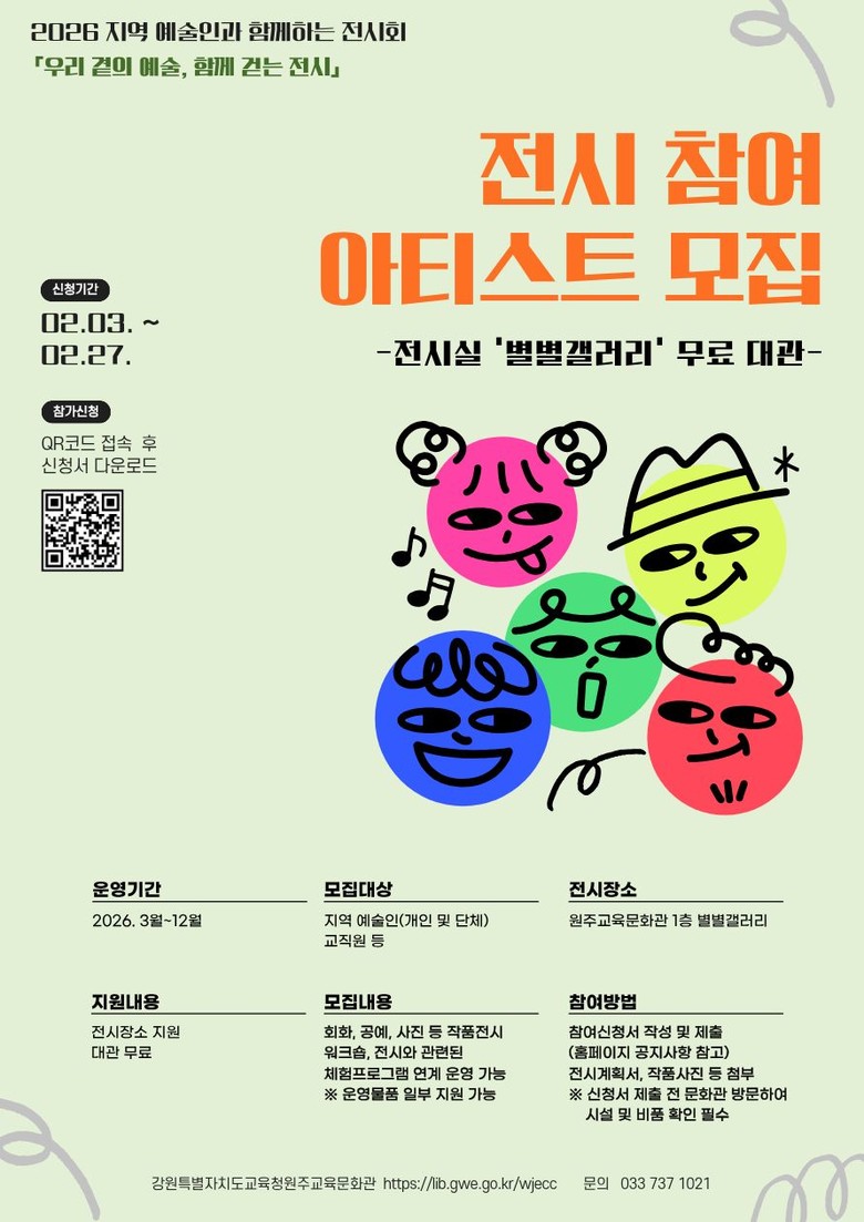 이번 사업은 지역 예술인, 예술단체 및 교직원 등을 대상으로 원주교육문화관 1층 전시실 ‘별별갤러리’를 무료로 대관하는 사업으로, 오는 3월부터 12월까지 매월 전시를 진행할 예정이다.