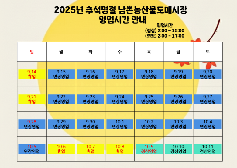 또한 시민들의 장보기 편의를 위해 시장 영업시간을 기존 오후 3시에서 오후 5시까지 2시간 연장한다. 정기 휴무일인 9월 28일과 10월 5일에도 정상 운영해 추석 장보기에 불편이 없도록 할 계획이다. 다만 추석 연휴 기간인 10월 6일부터 8일까지는 휴업하고, 9일부터 영업을 재개한다.