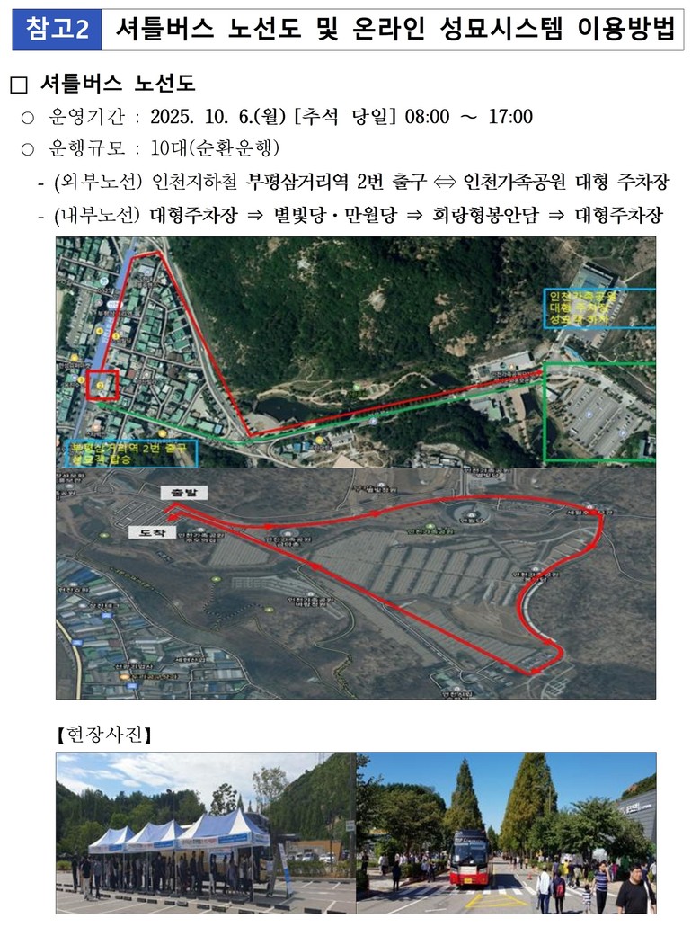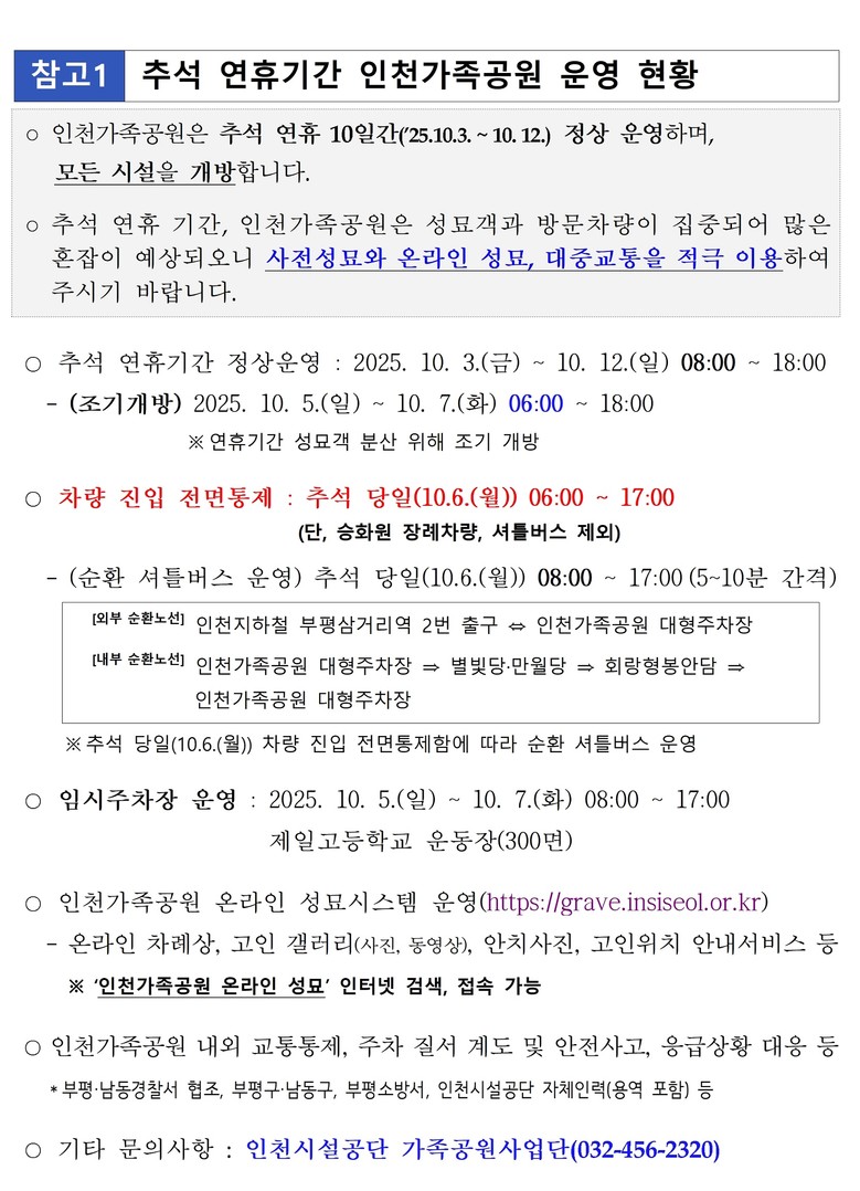 특히 추석 당일(10월 6일·월)에는 인천가족공원 입구부터 차량 진입을 전면 통제(단, 승화원 장례차량·셔틀버스 제외)하며, 성묘객 편의를 위해 인천가족공원 내외부를 순환하는 무료 셔틀버스를 전년 대비 2대 증차한 총 10대 운영할 예정이다.
