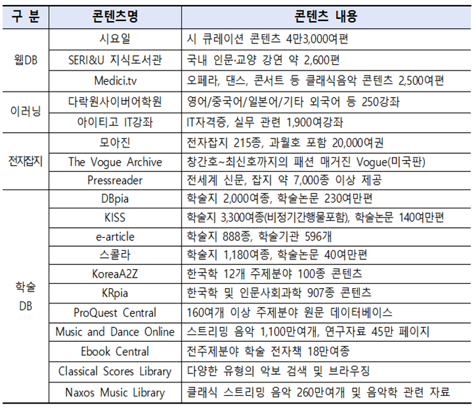 하루 한 편의 시로 시민들의 마음을 채워주는 ▲시큐레이션 콘텐츠, 경제·인문·경영 트렌드 등을 제공하는 ▲비즈니스 콘텐츠, 취향별 접근을 통해 다양한 장르를 폭넓게 경험하게 해주는 ▲클래식 ▲오페라 ▲무용 등의 콘텐츠와, 개인의 성장을 지원하는 ▲어학·정보 기술(IT) 관련 인터넷 학습(이러닝) 콘텐츠, 학술연구자를 위해 전문 자료 접근성을 극대화해주는 ▲학술 데이터베이스(DB)는 물론, 세계 각국의 시사 정보를 신속하게 접할 수 있는 ▲전자잡지 ▲신문까지 전 세대가 함께 즐길 수 있는 다채로운 온라인콘텐츠들을 준비하고 있다.