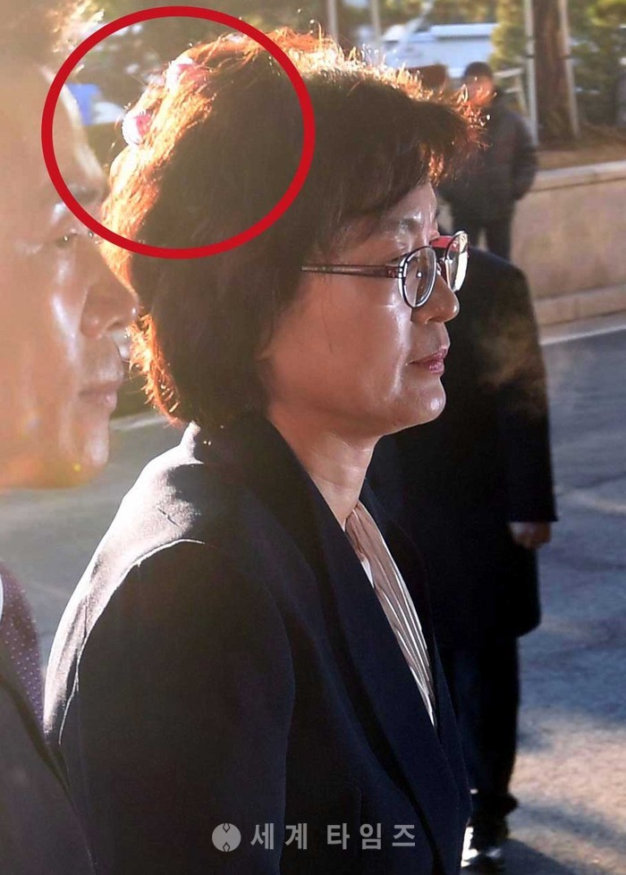 박근혜 대통령 탄핵심판 선고일인 10일 오전 서울 종로구 헌법재판소에 이정미 헌재 소장 권한대행이 헤어롤(빨간원)을 풀지 못한채 출근하고 있다.