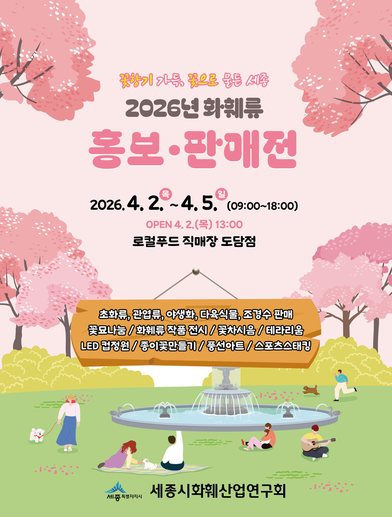 - 2~5일 '2026년 화훼류 홍보판매전' 개최…꽃묘나눔·전시 등 진행 - [세종 세계타임즈=이현진 기자] 세종특별자치시농업기술센터(소장 피옥자)가 화훼산업연구회와 함께 2일부터 오는 5일까지 싱싱장터 도담점에서 ‘2026년 세종 화훼류 홍보판매전’을 개최한다.