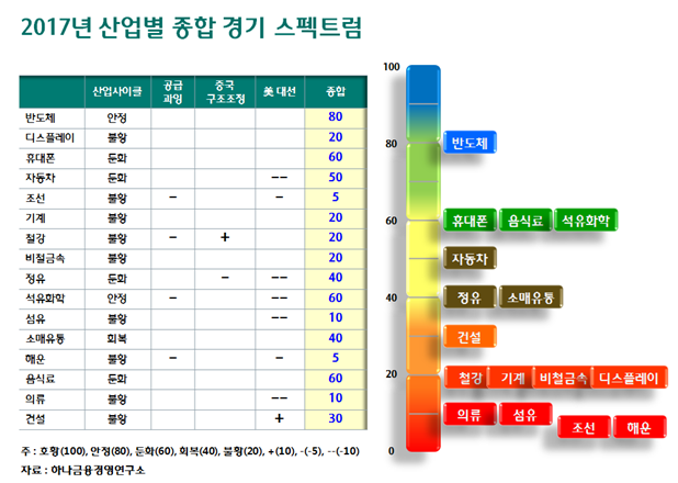 동 연구소가 발표한 산업별 경기 스펙트럼에서 유일하게 청색 존에 위치한 업종은 반도체이며 휴대폰, 음식료, 석유화학 등은 녹색 존에 위치해 비교적 안정적인 한 해를 맞이할 것으로 예상된다.