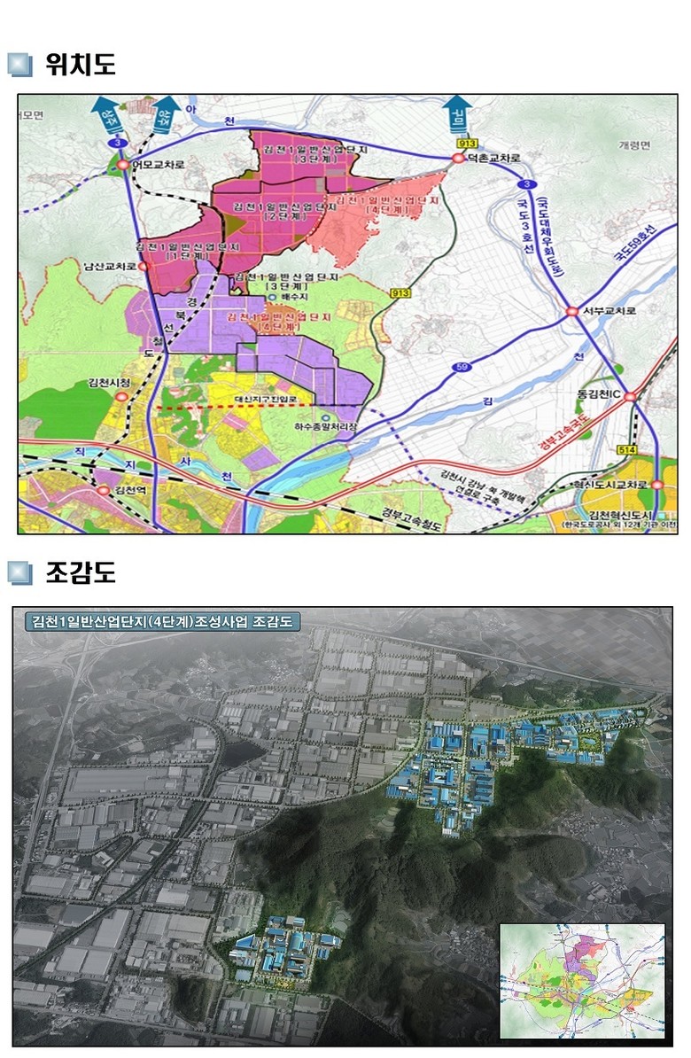 【김천1일반산업단지(4단계) 조성사업 개요】 ○ 위 치 : 김천시 어모면 다남리, 개령면 신룡리, 대광동 일원 ○ 면 적 : 1,240,593㎡ ○ 사 업 비 : 3,189억 원 ○ 사업기간 : 2021년 ~ 2029년 ○ 시 행 자 : 김천시장 ○ 유치업종 : 음식료품, 화학제품, 금속가공, 전기장비, 기계장비, 자동차 및 운송장비 등 |